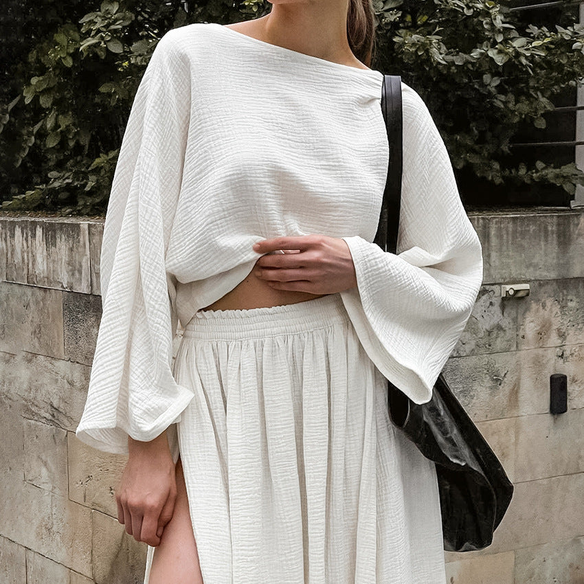 Cotton Round Neck Long Sleeves & Slit Skirt Set