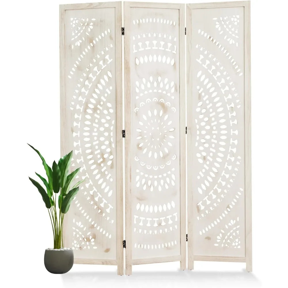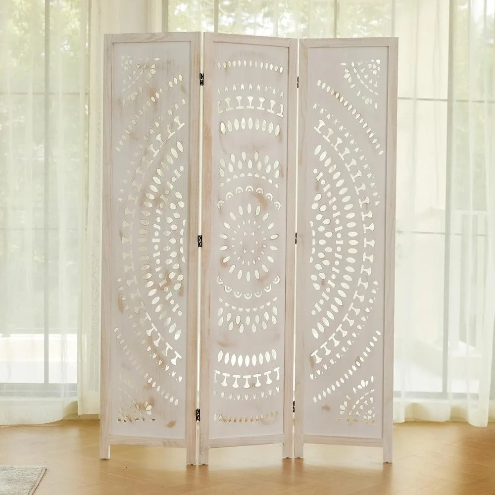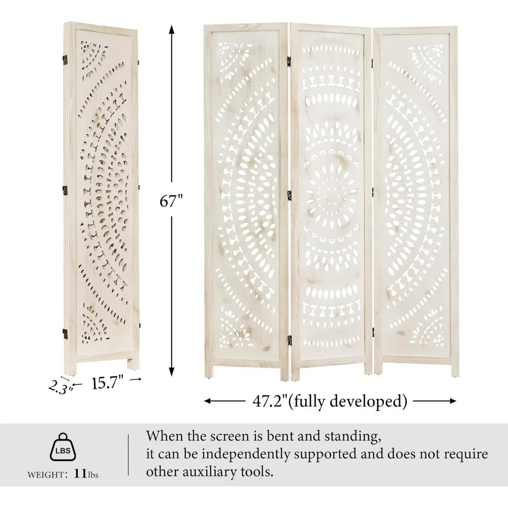 66.9Inch Folding Room Divider, 3 Panels Wood Carved Privacy Screens, Free Assembled Freestanding