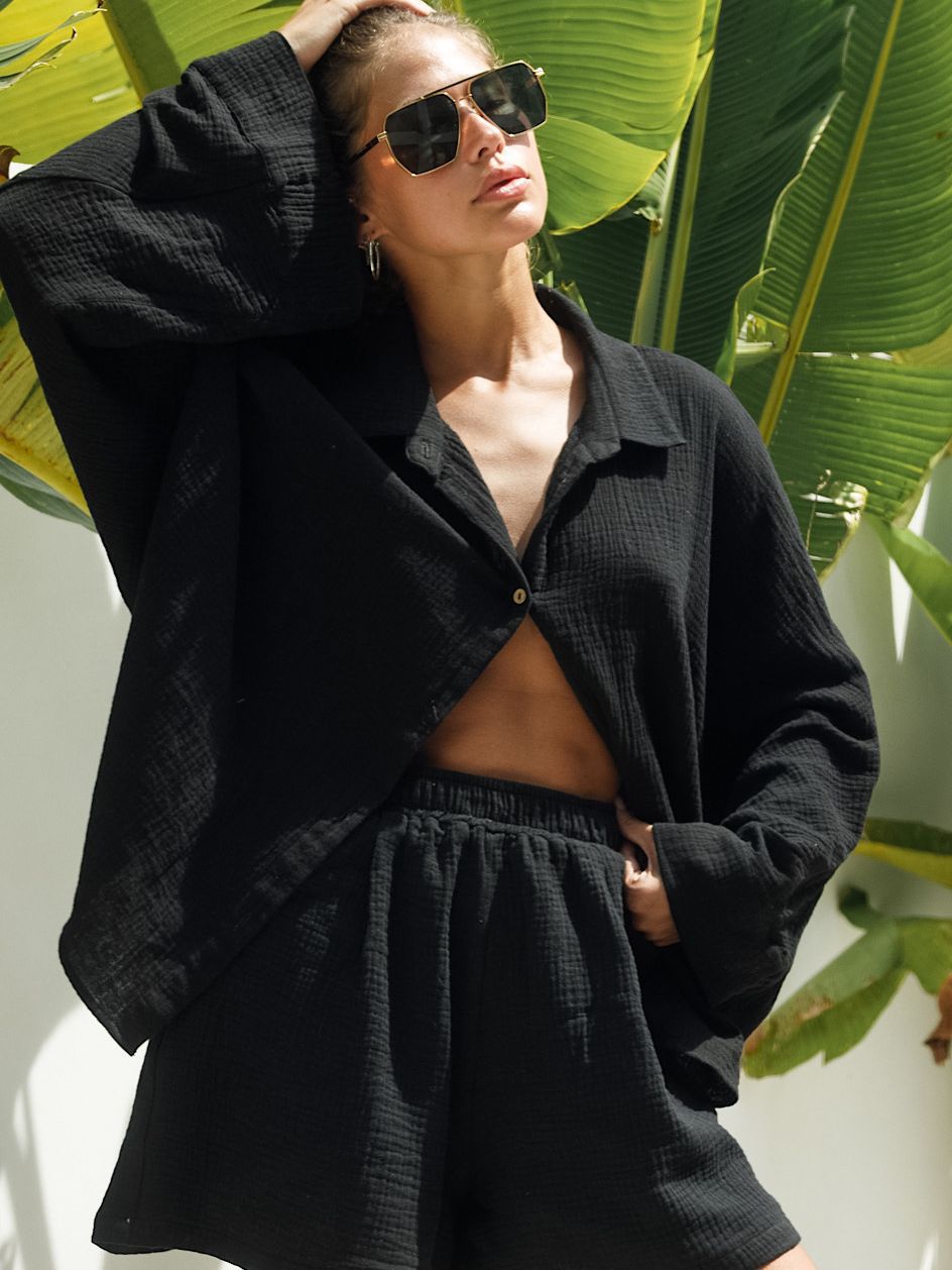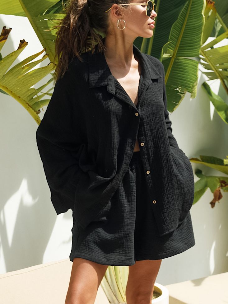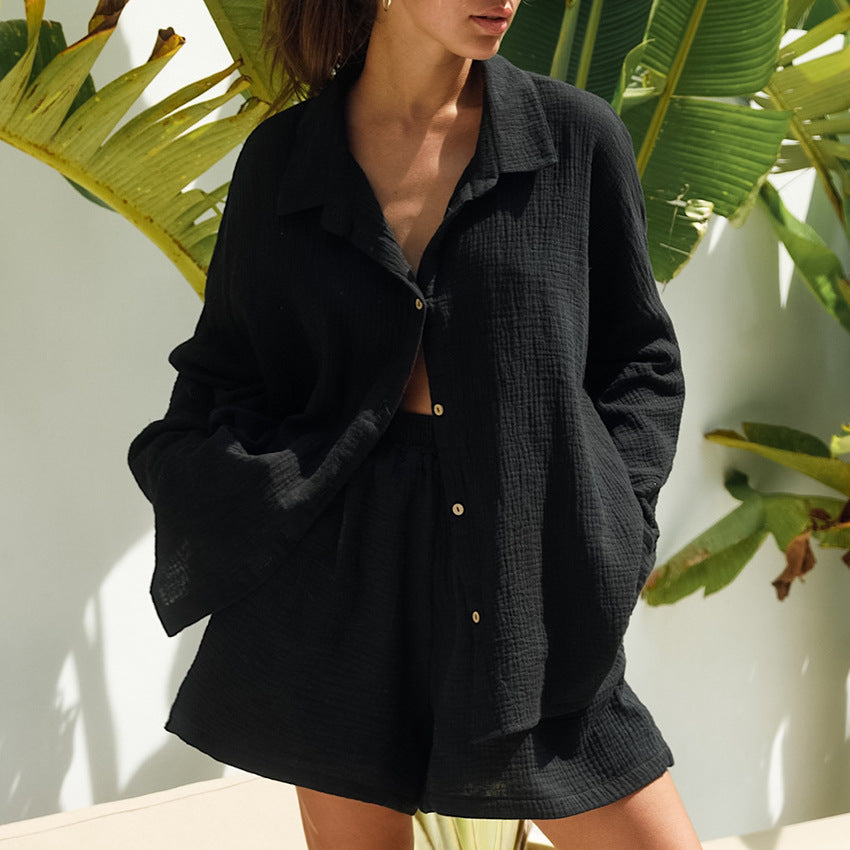Simple Elegant Long Sleeve Blouse High Waist Wide Leg shorts