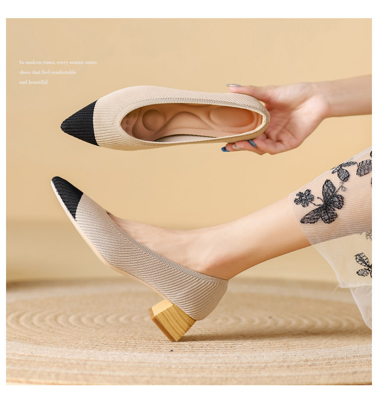 Wood Grain Thick Heel Pointed Breathable Casual flat